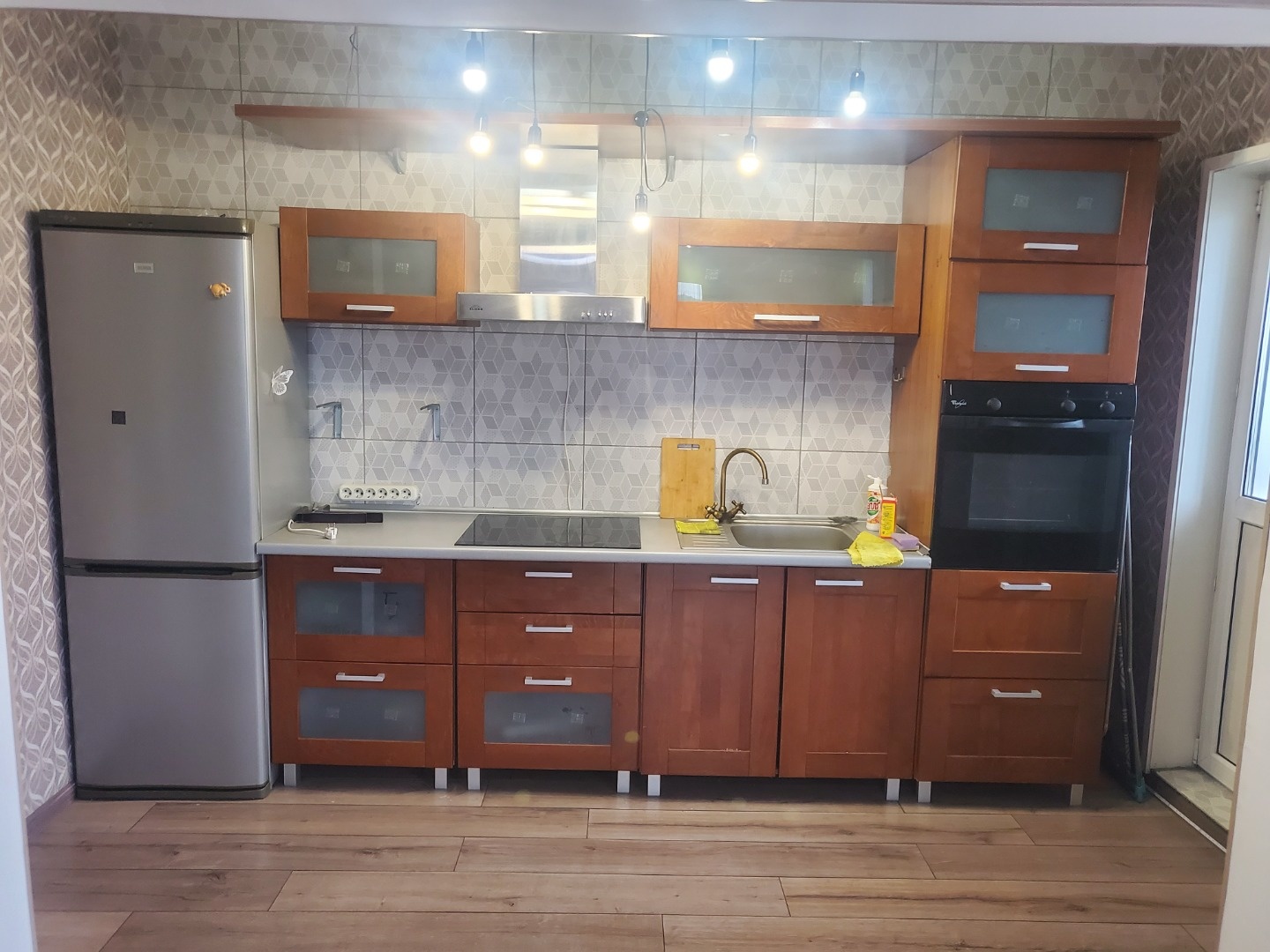 На кухне: встроенный гарнитур с бытовой техникой ( варочная поверхность, духовой шкаф, микроволновая печь, холодильник, чайник)