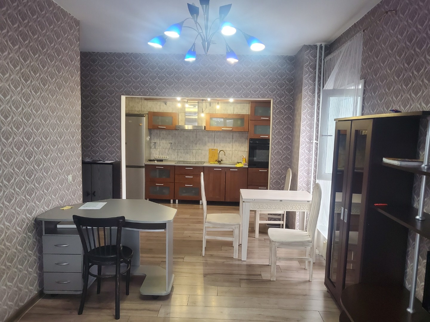 В комнате: диван, стенка, компьютерный стол, обеденный стол, стулья