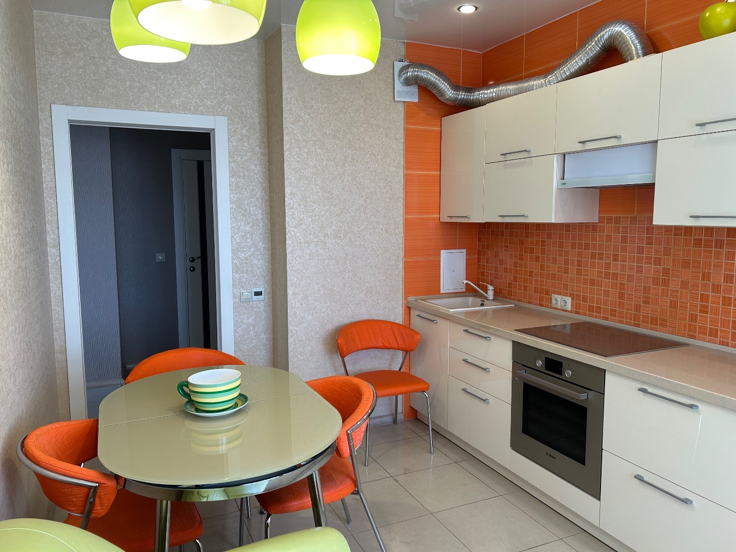 - Кухня площадью 11,2 кв. м — яркая кухня с функциональным пространством для приготовления и приема пищи.