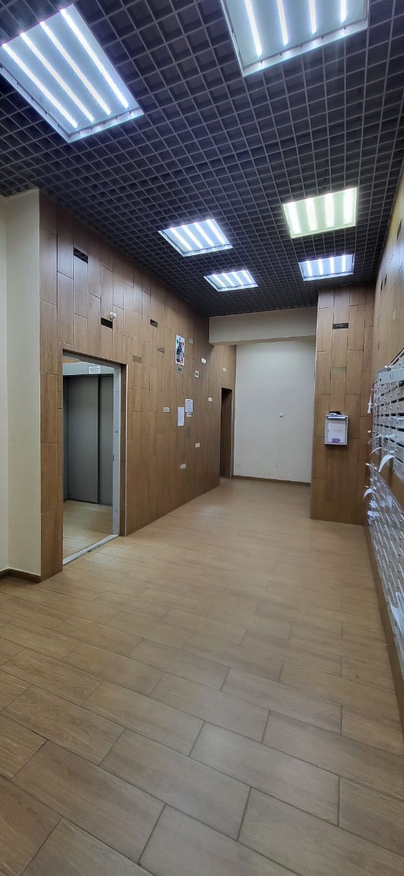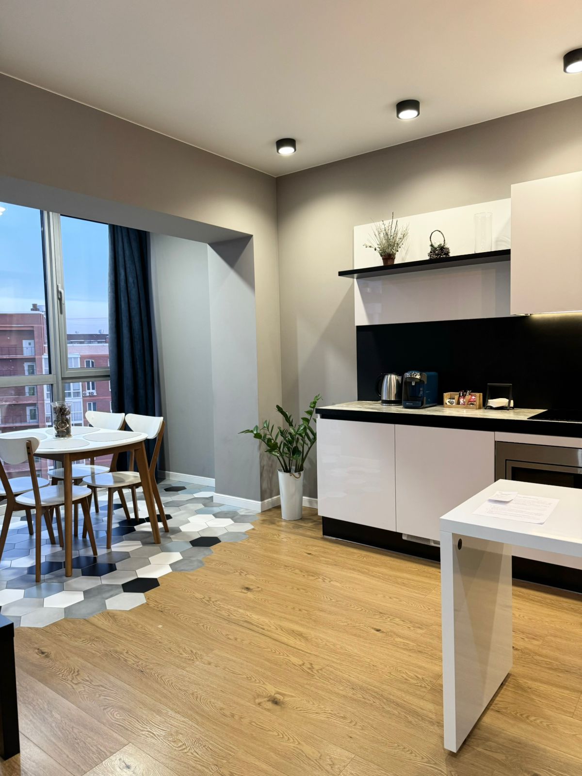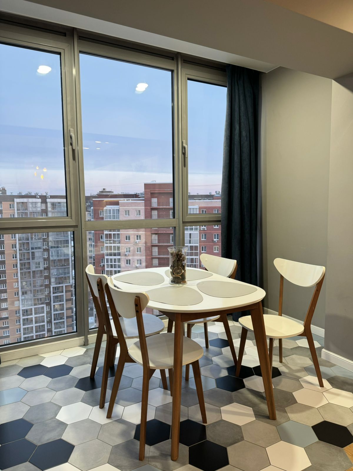 Общая площадь с объединенным балконом — 43,5 м². Квартира находится на 17 этаже, окна панорамные.