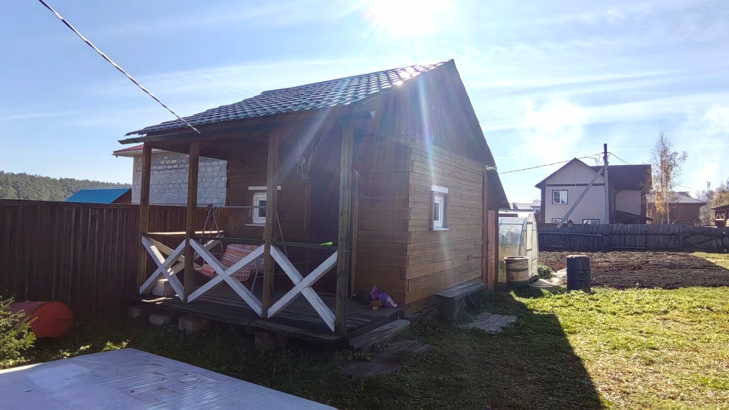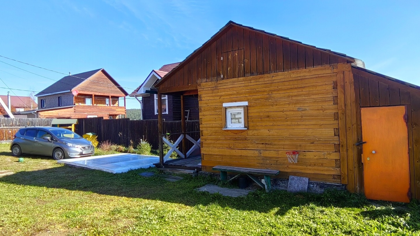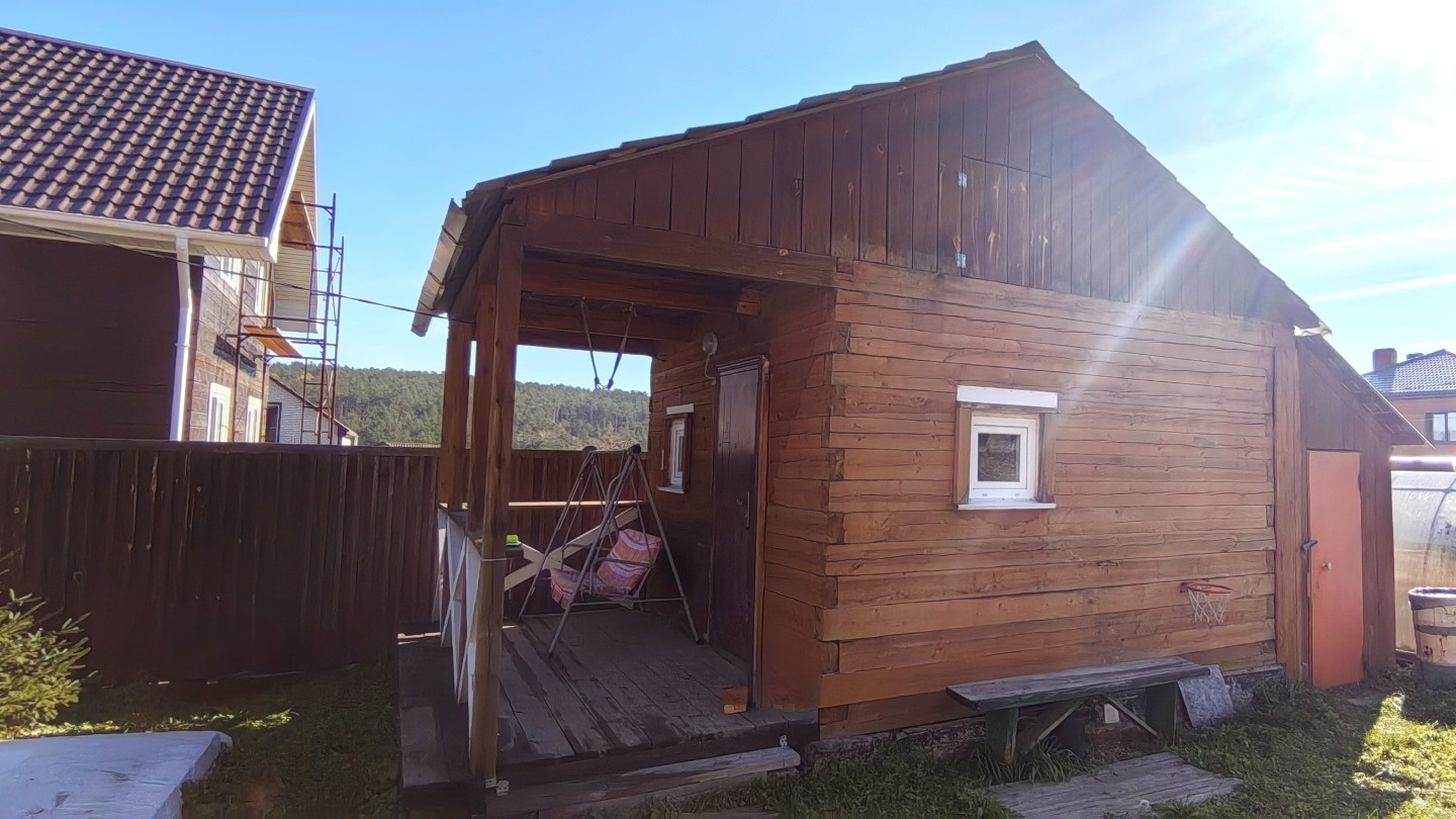 Участок шесть соток, на нем расположена баня, рядом площадка для бассейна.