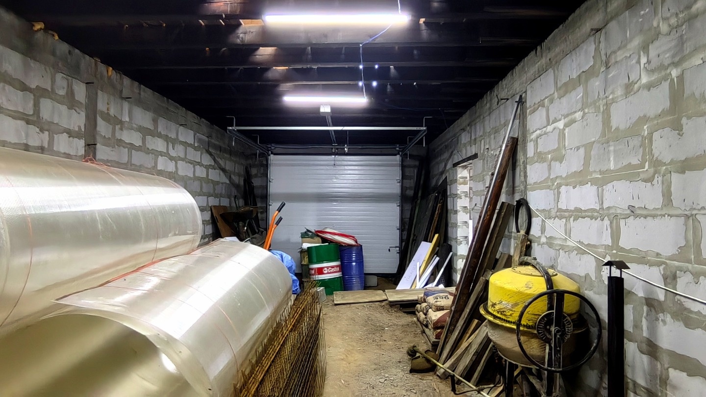 На первом этаже большая кухня-гостиная большой санузел и гараж на четыре машины.